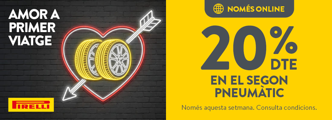 Durant aquesta setmana compra online els teus pneumàtics Pirelli i emporta't un 20% de descompte en la segona unitat.