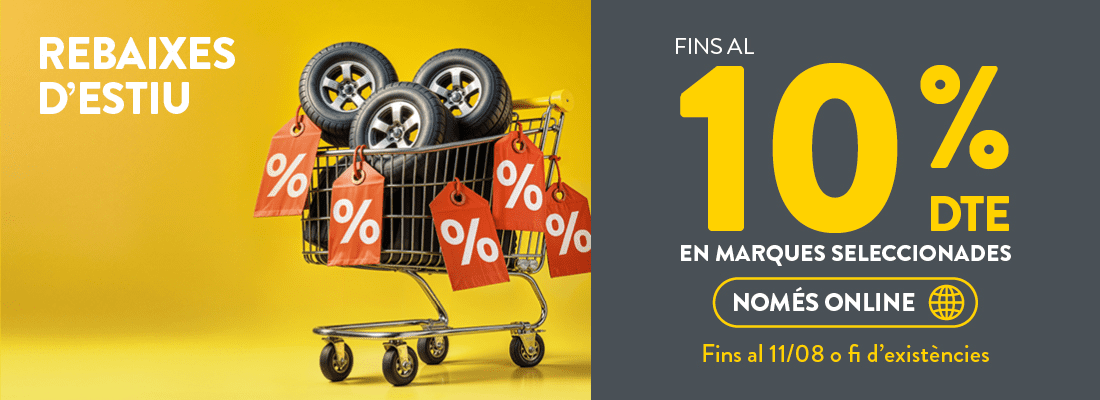 Promoció vàlida per compres ONLINE des del 01/08/2024 fins al 11/08/2024 o fi d'existències. Descompte online en pneumàtics per a cotxes tipus turisme, SUV, 4x4 i furgonetes i només en marques seleccionades: Michelin, Pirelli, Falken, Goodyear, Dunlop i RoadX. Limitada a 1 participació per NIF. Consulta les condicions legals de la promoció fent clic aquí.